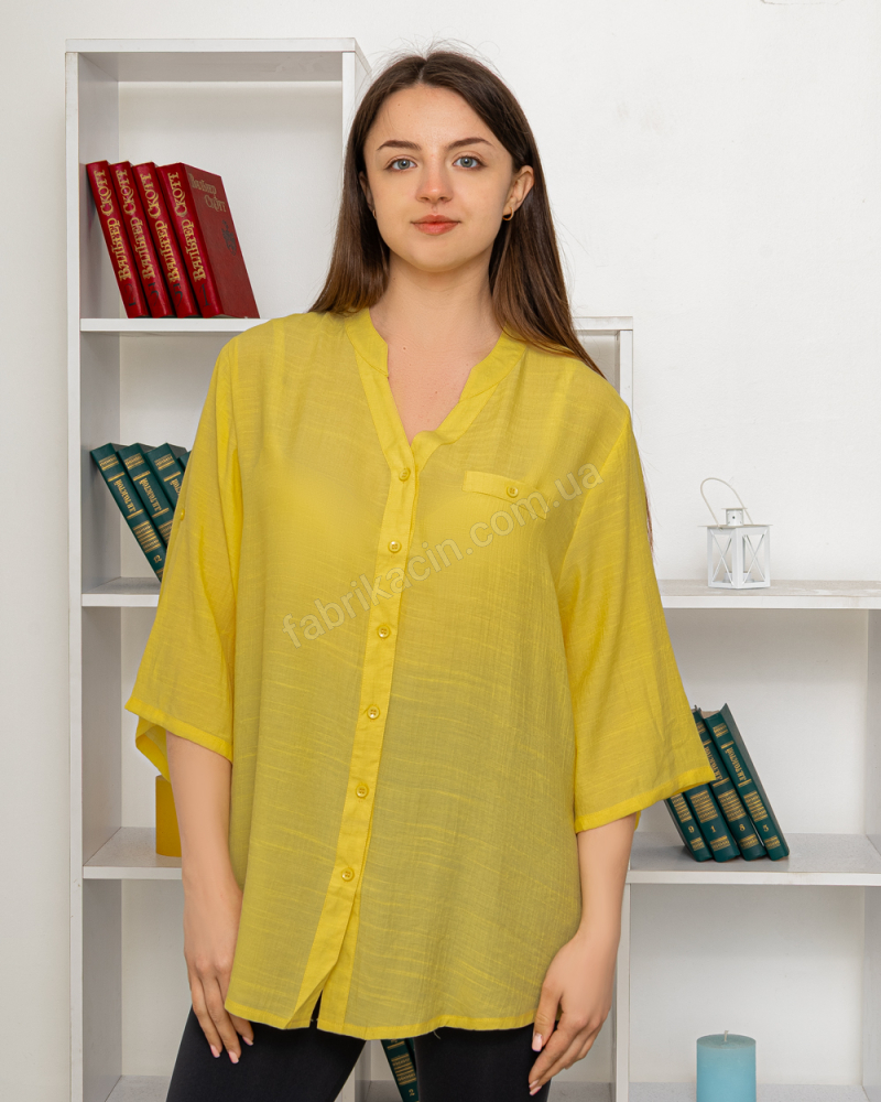 Однотонна блузка, універсальна, повсякденна з дуже легкої і приємної тканини - 78% бавовни. Легка, дихаюча, вільного крою, не сковує рухи. Рукав короткий, можна застебнути на ґудзик, V-подібний виріз на ґудзиках.