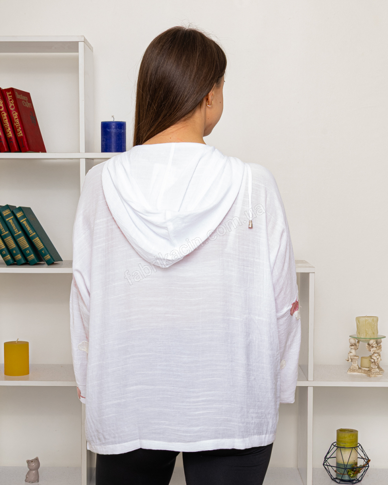 Легка блузка на блискавці з капюшоном - 78% бавовни. Комфортна та легка, повсякденна. Вільна в грудях, нижче трохи вужча. Капюшон і блискавка надає сучасного акценту, в стилі легкої зіп-кофти. Прикрашена вишивкою у вигляді листя пудрового відтінку.