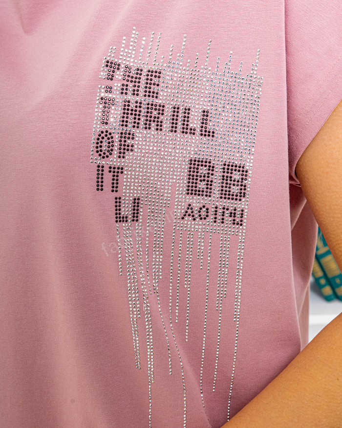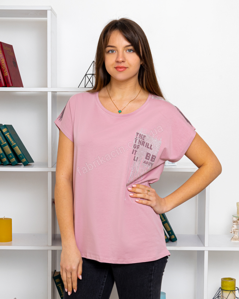 Однотонна футболка зі стразами, вільного крою, з круглим вирізом. Чудова футболка виготовлена з якісного матеріалу, сучасного стилю.