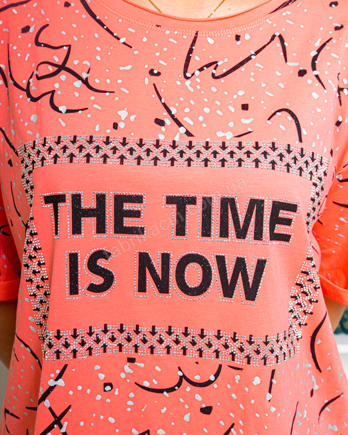 Футболка 95% cotton, вільного крою, з підкоченим руковом, край низу футболки не обробленний, на грудях напис і стрази, представлена в одному розмірі - OneSize приблизно на розміри: 52-54