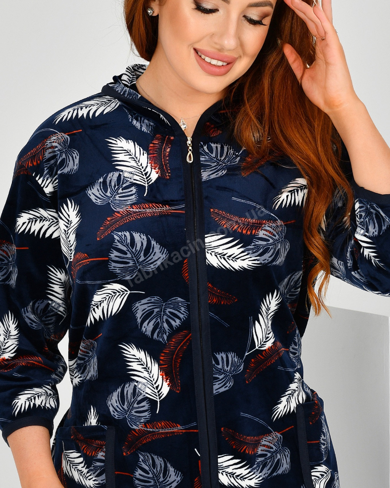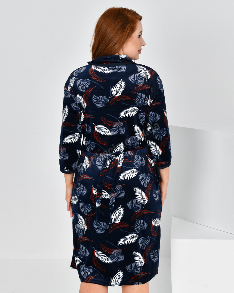 Комфортний і м'який халат з рукавом 3/4, який не хочеться знімати, з високоякісної велюрової тканини у листочки з двома кишенями і зав'язується пояском ззаду, еластичний - добре тягнеться. Саме велюровий халат обов'язково стане вашим улюбленим одягом для дому, адже велюр по праву вважається одним з найоптимальніших матеріалів для пошиття домашнього одягу.