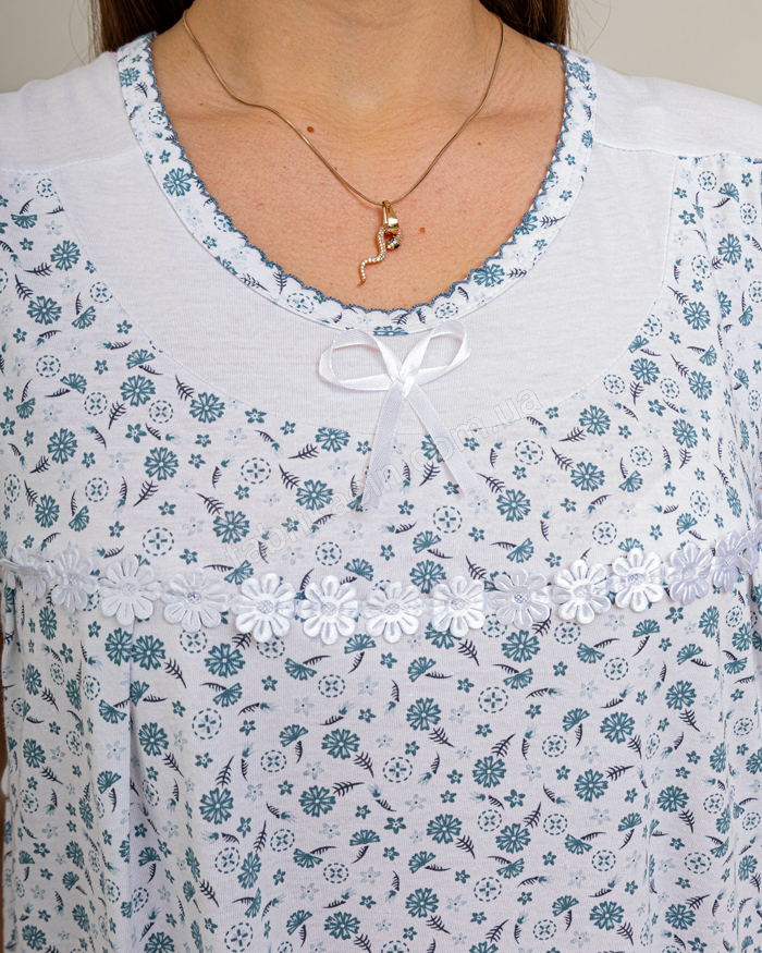 Нічна сорочка виготовлена з м'якого трикотажу, ідеально підходить для сну та відпочинку. Вільного крою, не сковує рухи. Верх оздоблений декоративними вставками, мереживними квітами та маленьким бантиком. Ніжний квітковий принт. Матеріал: 100% бавовна. Обираючи розмір, дивитися таблицю розмірів нижче! УВАГА: розмір, розташування і вигляд квіточки може незначно відрізняться від фотографії!