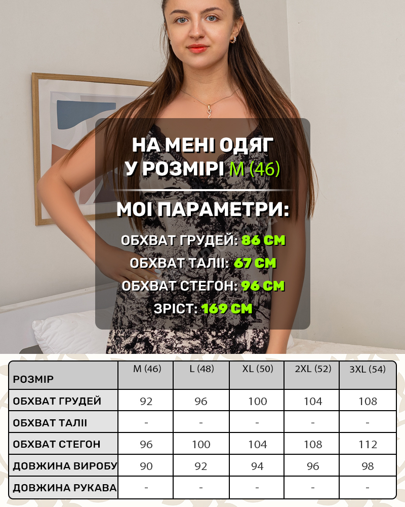 Легка трикотажна нічна сорочка на бретелях (регулюються). М'який та приємний до тіла матеріал. Комфортна і зручна для сну і відпочинку. Принт у французькому стилі «Туаль де Жуї» (Toile de Jouy) -  зображені дерева, тварини, силуети людей.   Матеріал: 100% бавовна