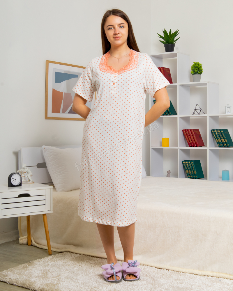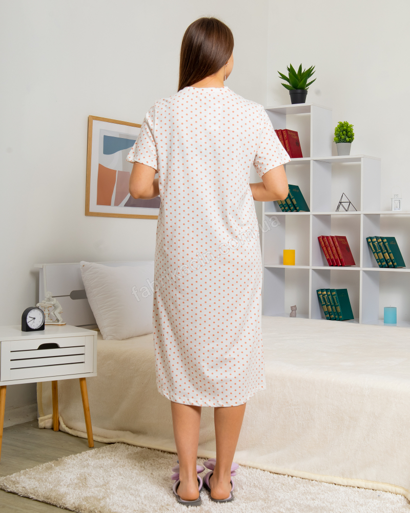 Жіноча нічна трикотажна сорочка на чотирьох ґудзичках з м'якої, якісної бавовняної тканини приємна на дотик і до тіла, в ній дуже комфортно та зручно.