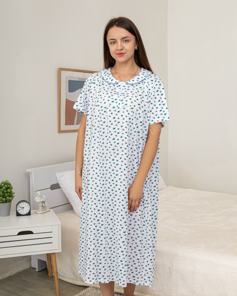 Трикотажна нічна сорочка з коротким рукавом. Приємна до тіла, комфортна і зручна ночнушка для сну і відпочинку. Має ніжний квітковий принт. Вільного крою, не сковує рухи.
