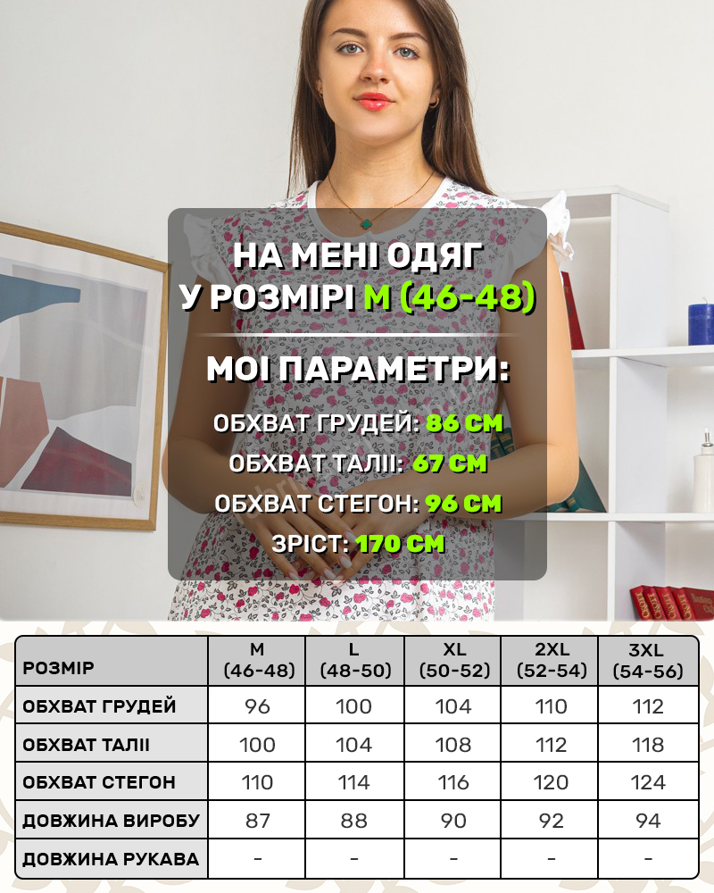 Матеріал: бавовна 100%, квітковий принт, середньої довжини. Жіноча нічна сорочка з якісної трикотажної бавовняної тканини приємна на дотик і до тіла, в ній дуже комфортно і зручно, вибираючи розмір, дивіться на розмірну сітку нижче