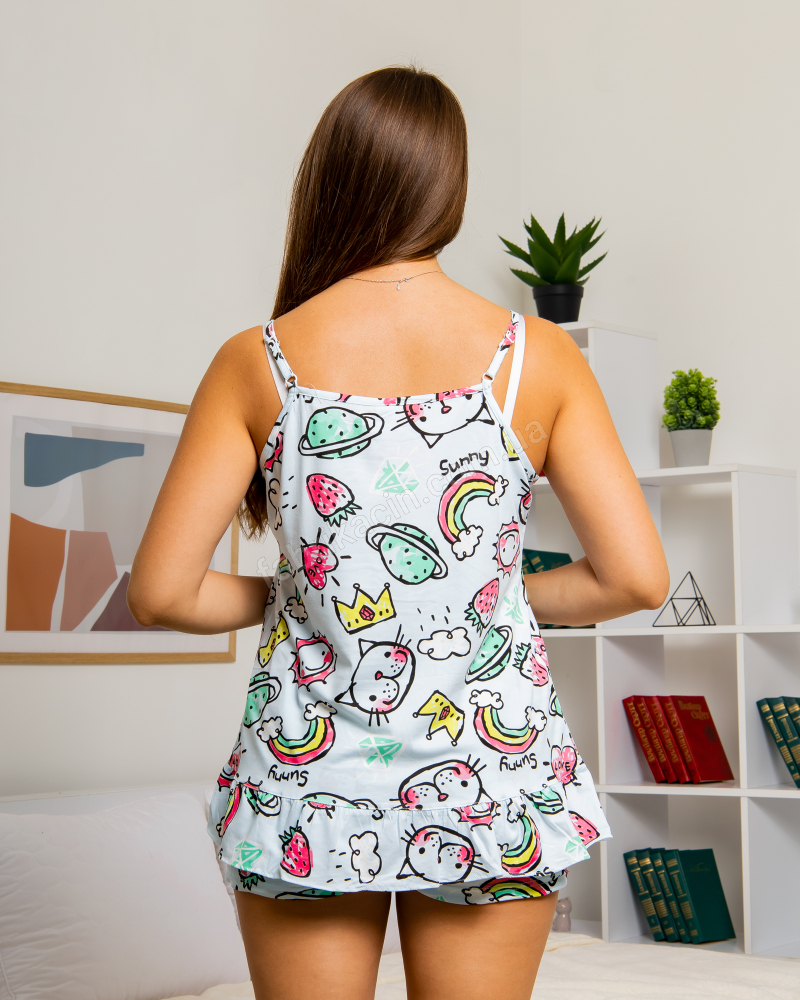 Піжама, комплект одягу:майка з малюнком,та шорти з малюнком. Склад тканини: 95% light net low elastic wire 5% SPANDEX Виробництво: фабричний Китай