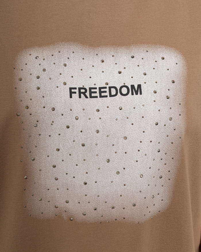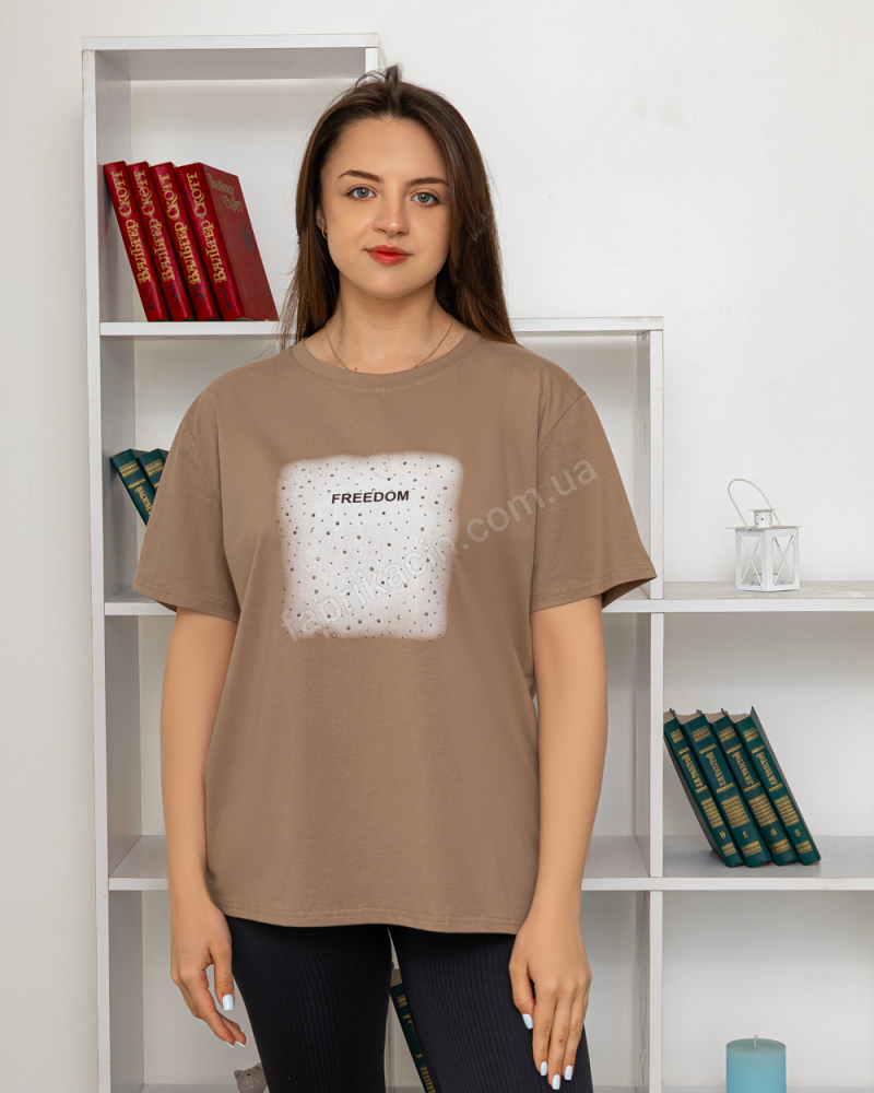 Футболка 95% хлопок, украшена стразами, ефект потертости, надпись "Freedom", свободный крой, круглый вырез. Замечательная футболка изготовлена из качественного хлопкового трикотажа. Представлена в одном размере - OneSize, подойдет на размер от 50 до 54