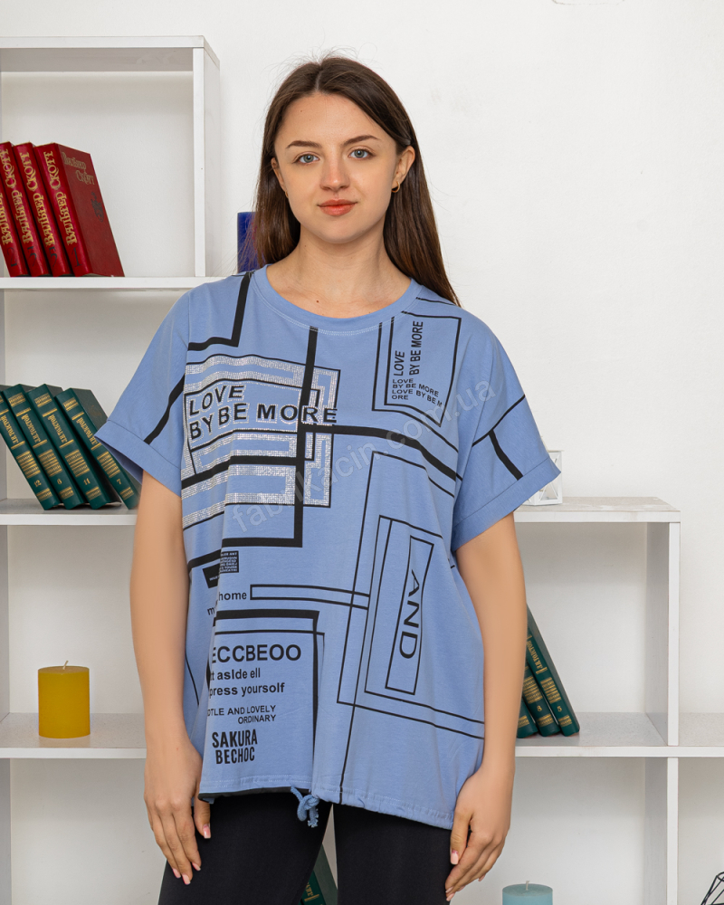 Футболка 95% хлопок, c принтом, свободный крой, круглый вырез. Замечательная футболка изготовлена из качественного хлопкового трикотажа. Внизу изделия вставленный шнурок, которым можна фиксировать длину и ширину. Представлена в одном размере - OneSize, подойдет на размер от 58 до 62
