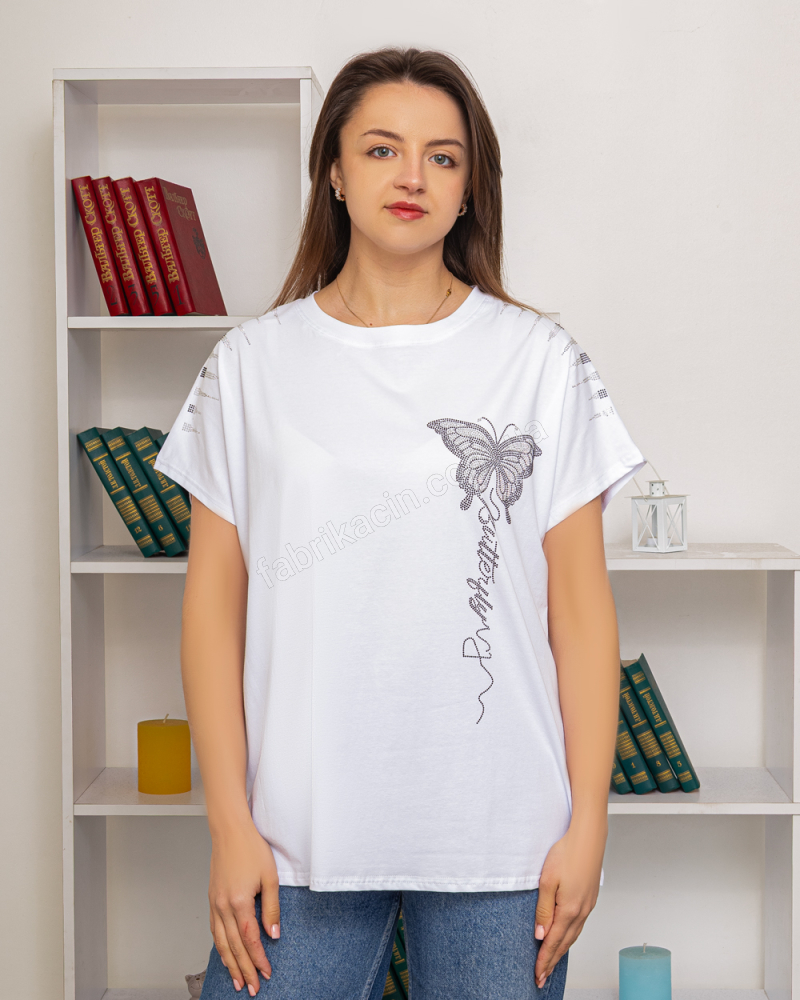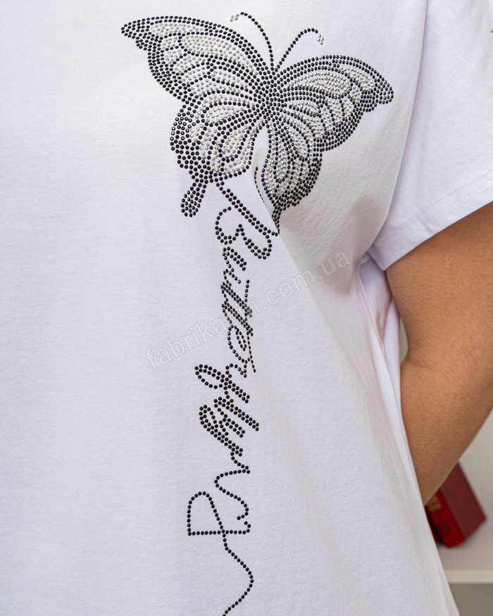 Футболка 95% хлопок, украшена стразами, свободный крой, круглый вырез, приспущенный рукав. Замечательная футболка изготовлена из качественного хлопкового трикотажа. Представлена в одном размере - OneSize, подойдет на размер от 54 до 58