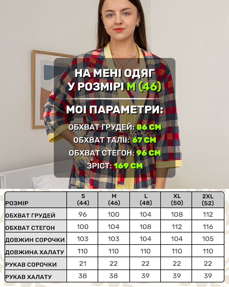 Мы замеряли ночнушку и халат вручную, поэтому обратите внимание на размерную сетку ниже⬇ или на таблицу на последнем фото