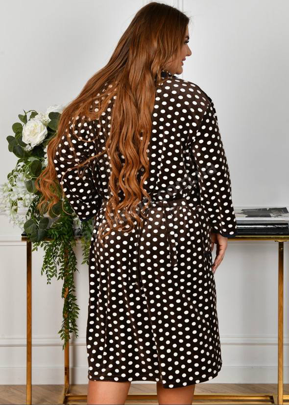 Комфортный и мягкий халат с рукавом 3/4, который не хочется снимать из высококачественной велюровой ткани в горох с двумя карманами и завязывающимся пояском сзади, эластичный- хорошо тянется. Именно велюровый халат обязательно станет вашей любимой одеждой для дома, ведь велюр по праву считается одним из самых оптимальных материалов для пошива домашней одежды.