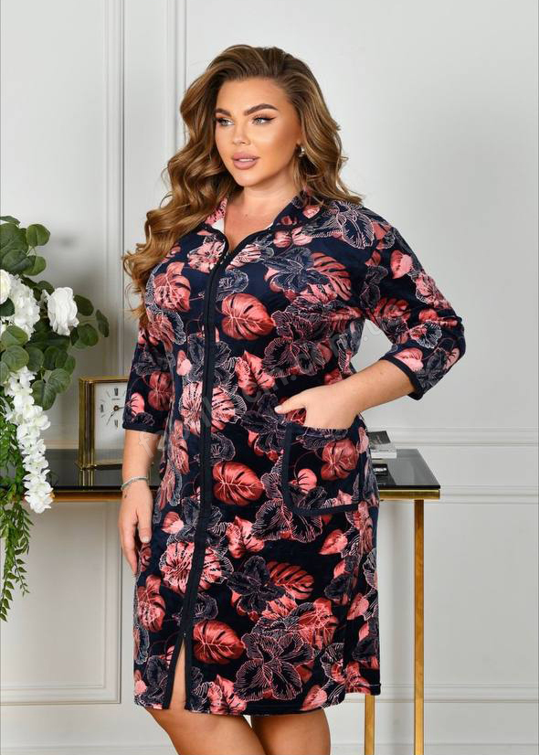 Комфортный и мягкий халат с рукавом 3/4, который не хочется снимать из высококачественной велюровой ткани в листочки с двумя карманами и завязывающимся пояском сзади, эластичный- хорошо тянется. Именно велюровый халат обязательно станет вашей любимой одеждой для дома, ведь велюр по праву считается одним из самых оптимальных материалов для пошива домашней одежды.