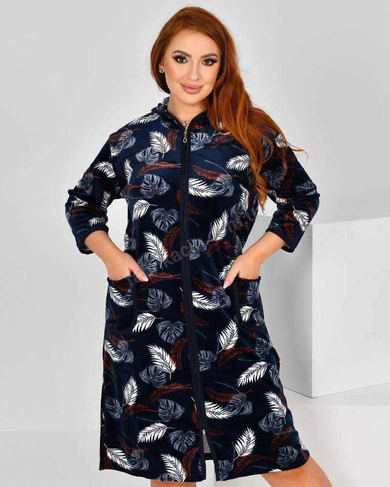 Комфортный и мягкий халат с рукавом 3/4, который не хочется снимать из высококачественной велюровой ткани в листочки с двумя карманами и завязывающимся пояском сзади, эластичный- хорошо тянется. Именно велюровый халат обязательно станет вашей любимой одеждой для дома, ведь велюр по праву считается одним из самых оптимальных материалов для пошива домашней одежды.