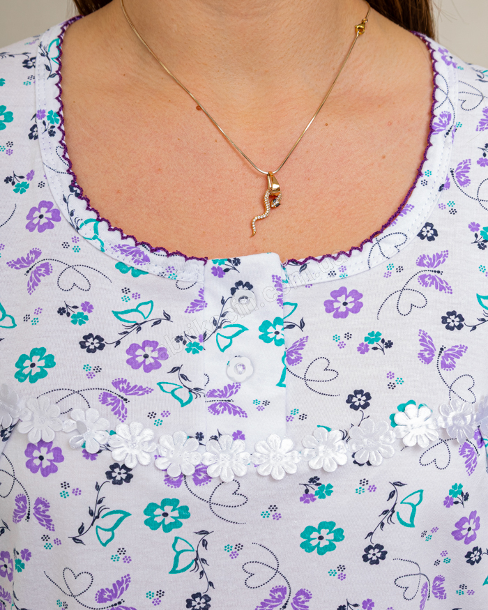 Трикотажная ночная рубашка с коротким рукавом, круглый вырез с окантовкой, на пуговицах. Приятная к телу, комфортная и удобная для сна и отдыха. Имеет нежный цветочный принт. Свободного кроя, не сковывает движения. Материал: 100% хлопок Выбирая размер, смотреть таблицу размеров ниже! ВНИМАНИЕ: размер, расположение и вид цветочка может незначительно отличатся от фотографии!