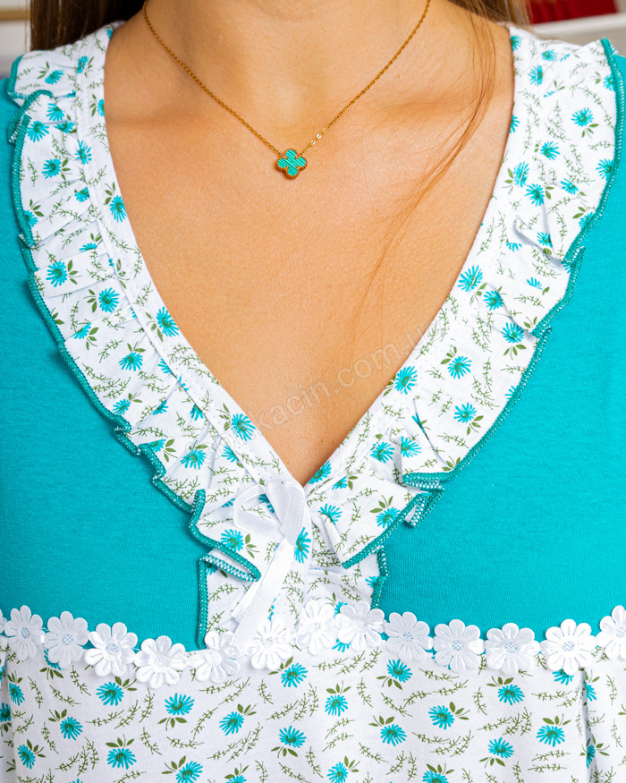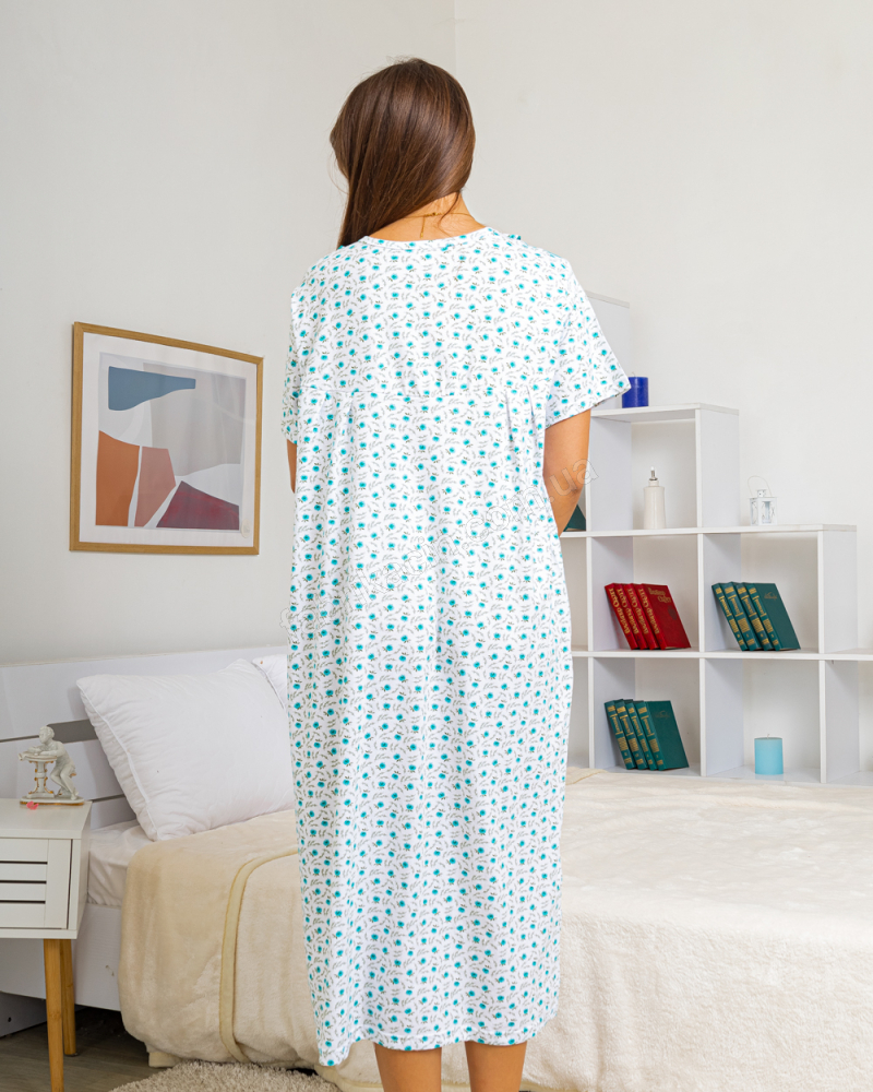 Трикотажная ночная рубашка, приятная к телу, комфортная и удобная для сна и отдыха. Имеет интересный, мелкий цветочный принт (цветочки могут не значительно отличатся от фото), сверху украшено декоративным цветком и цветной вставкой. Мы измерили изделие и записали в таблице размеров.