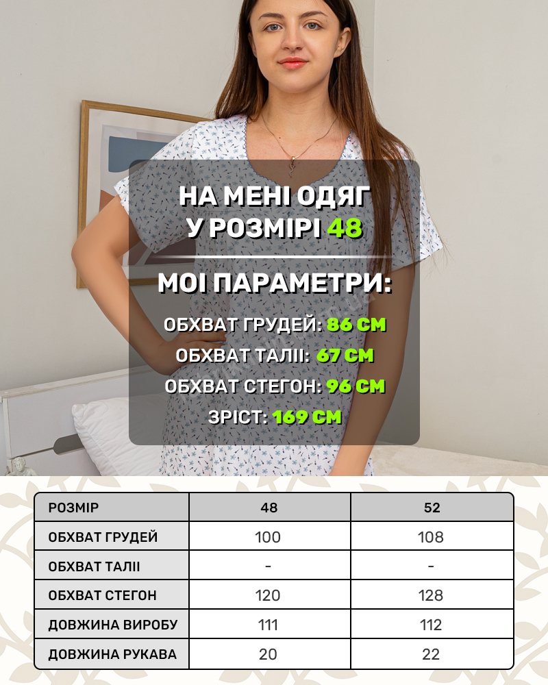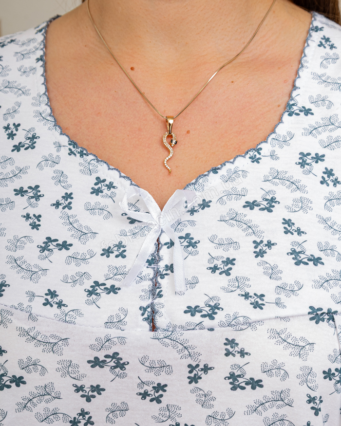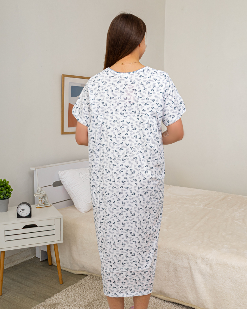Трикотажная ночная рубашка с коротким рукавом, V-образный вырез с оконтовкой. Приятная к телу, комфортная и удобная для сна и отдыха. Имеет нежный цветочный принт. Свободного кроя, не сковывает движения. Материал: 100% хлопок