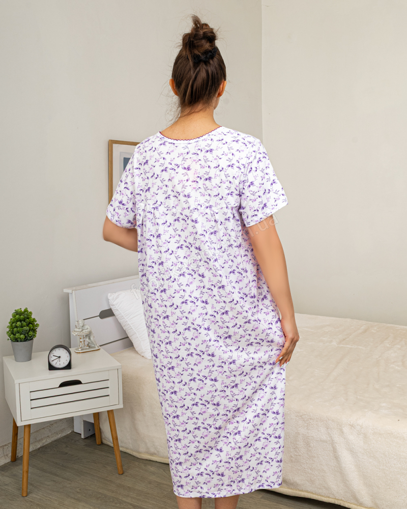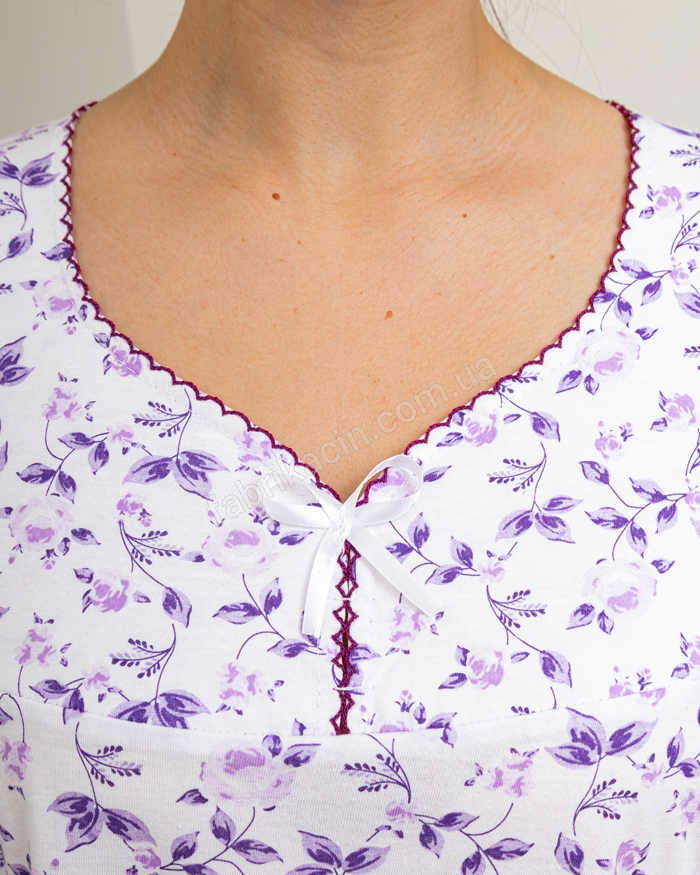 Трикотажная ночная рубашка с коротким рукавом, V-образный вырез с оконтовкой. Приятная к телу, комфортная и удобная для сна и отдыха. Имеет нежный цветочный принт. Свободного кроя, не сковывает движения. Материал: 100% хлопок