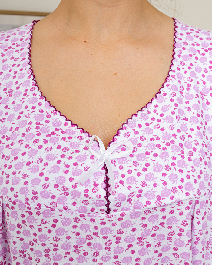 Трикотажная ночная рубашка с коротким рукавом, V-образный вырез с оконтовкой. Приятная к телу, комфортная и удобная для сна и отдыха. Имеет нежный цветочный принт. Свободного кроя, не сковывает движения. Материал: 100% хлопок