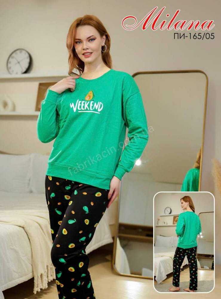 Домашний костюм, из плотной трикотажной ткани из 100% хлопка с начесом, утепление-байка. Свободный пошив кофты и свободные прямые штаны. Штаны на резинке, есть карманы, принт - авокадо. Рукав немного приспущеный. Выбирая размер смотрите размерную сетку ниже
