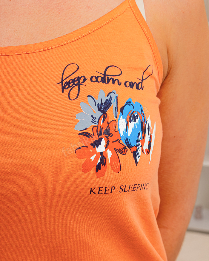 Женская трикотажная пижама, состоящая из майки на брителях и шорт с принтом. Майка однотонная с рисунком, брители не регулируются, приталенная к телу. Шорти на резинки с карманами, средняя посадка, идут приталеные, принт цветы.
