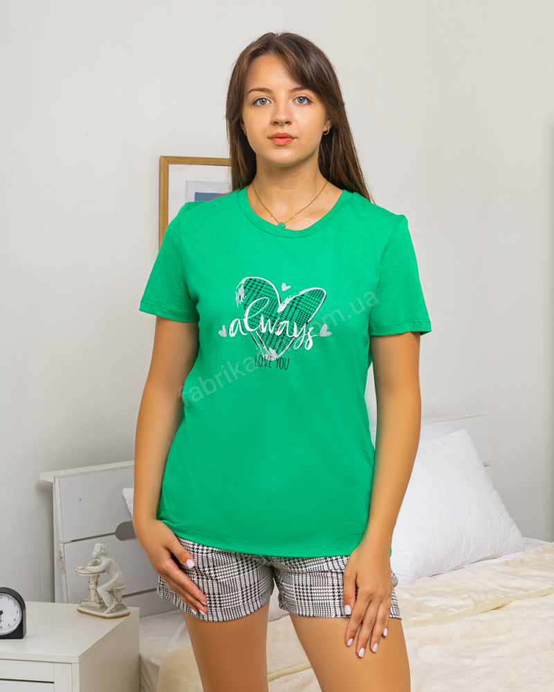 Пижама, комплект одежды для дома: футболка однотон с рисунком серца и шорты на резинке с карманами, принт - гусиная лапка . Состав ткани: 100% хлопок