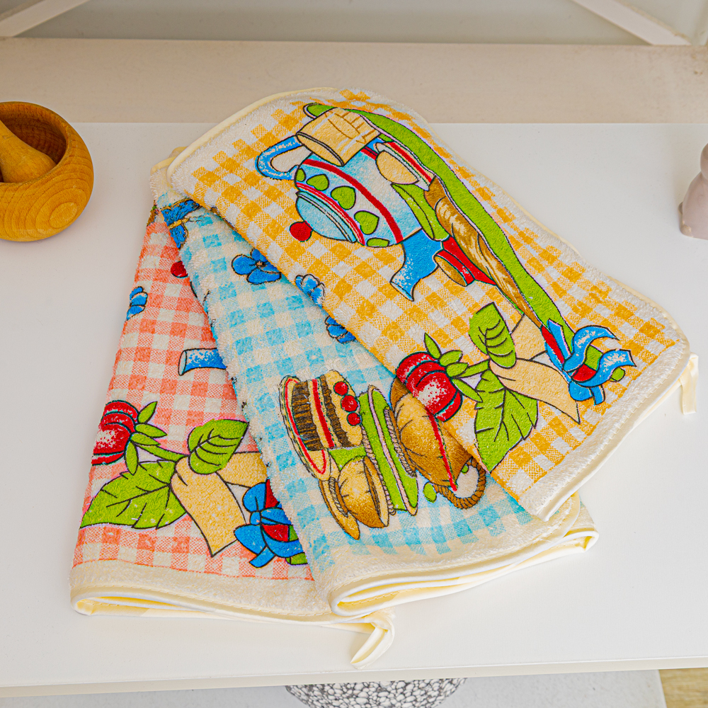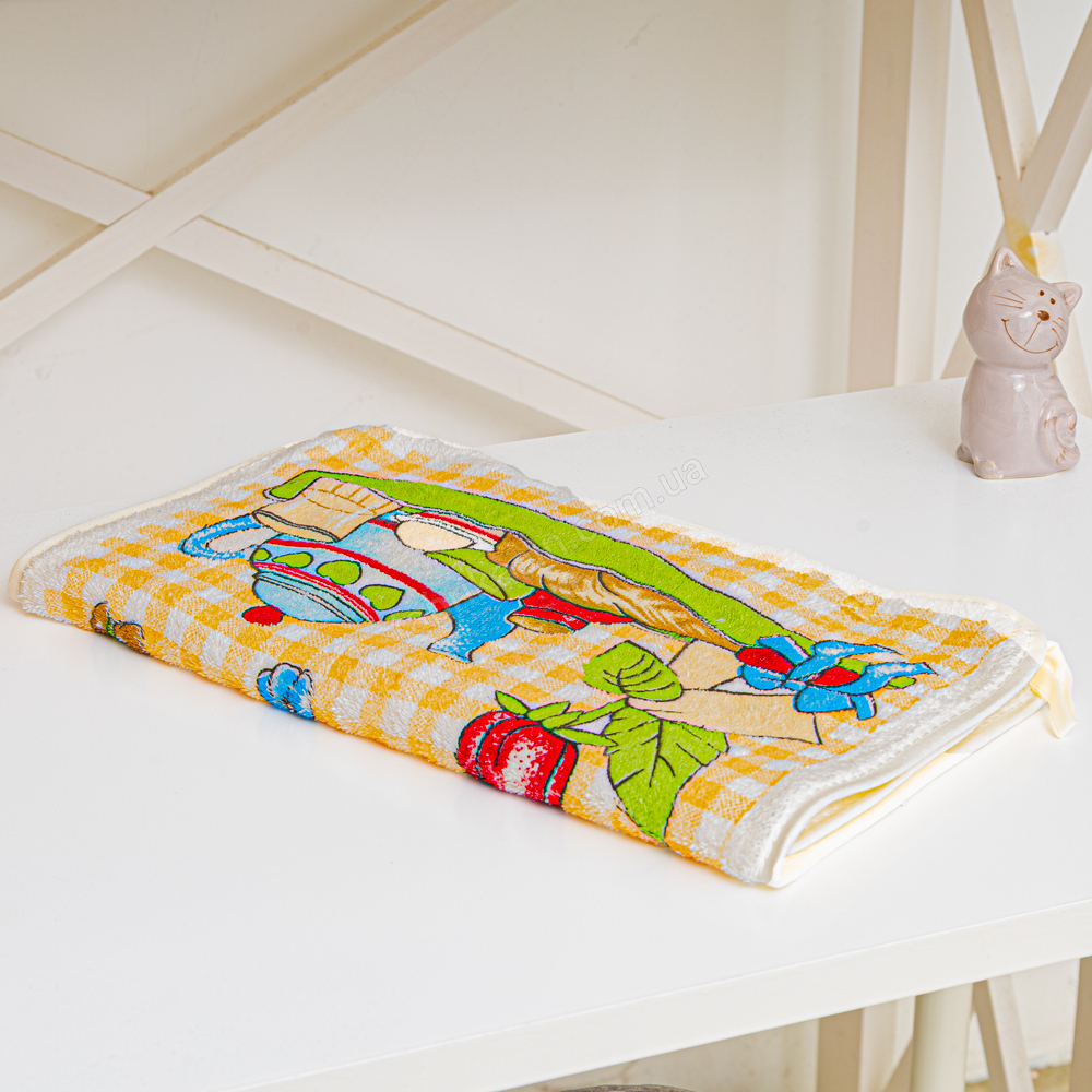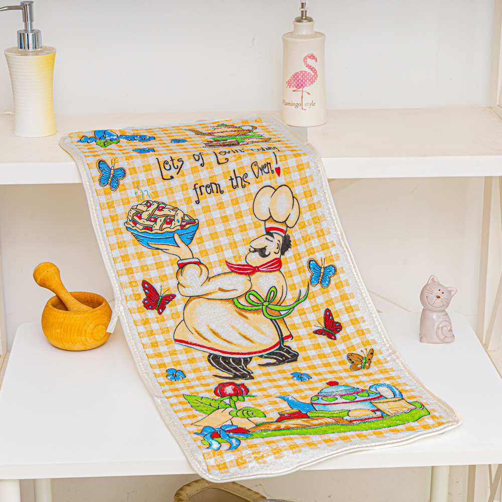 Кухонное полотенце из микрофибры, отлично впитывает влагу, быстро сохнет, и не оставляет разводов. Оригинальный рисунок с веселым поваром и уютным кухонным натюрмортом. Размер 35х75, удобный формат для использования в быту. Отлично подходит для потирания посуды, рабочих поверностей, а также в качестве декоративного элемента.