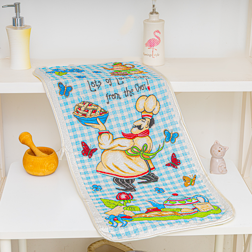 Кухонное полотенце из микрофибры, отлично впитывает влагу, быстро сохнет, и не оставляет разводов. Оригинальный рисунок с веселым поваром и уютным кухонным натюрмортом. Размер 35х75, удобный формат для использования в быту. Отлично подходит для потирания посуды, рабочих поверностей, а также в качестве декоративного элемента.