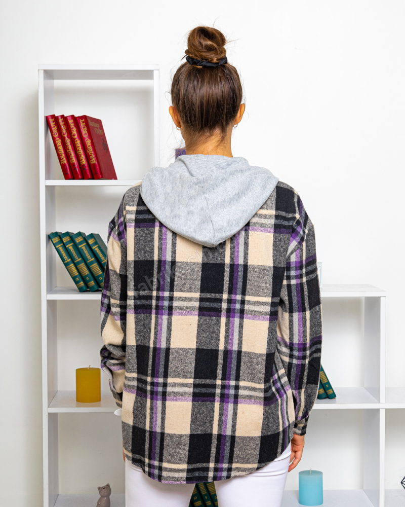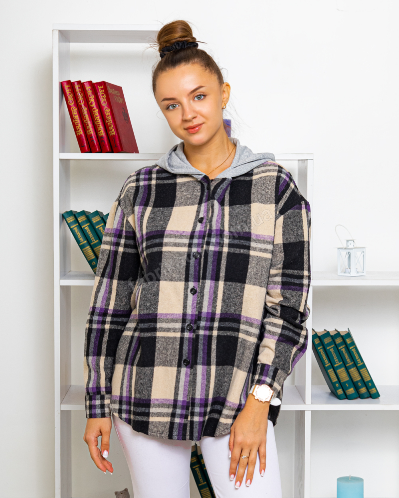Рубашка теплая в клетку с капюшоном 50 - 56 цвет: сиреневый