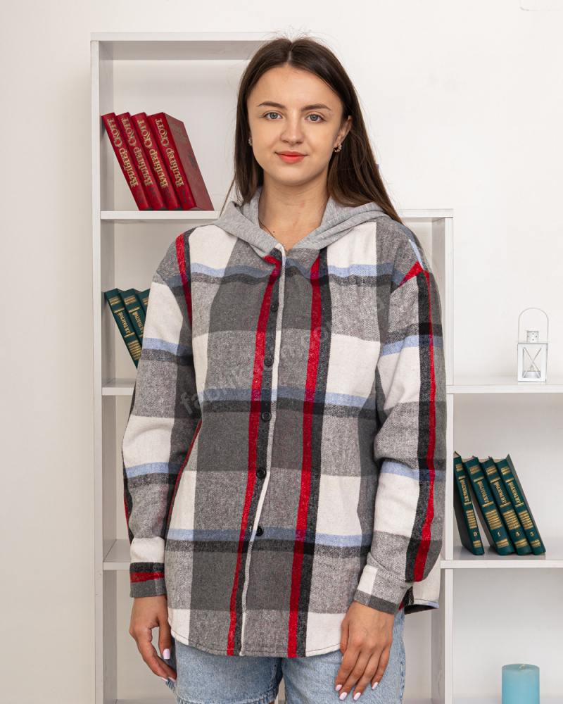 Рубашка в клетку с капюшоном, застегивается на пуговке. Перед немного короче спинки. В наличии размеры: 50(XL); 52(2XL); 54(3XL), 56(4XL). Обратите внимание на размерную сетку. Если необходим свободный вариант - оверсайз, выбирайте больше размер.