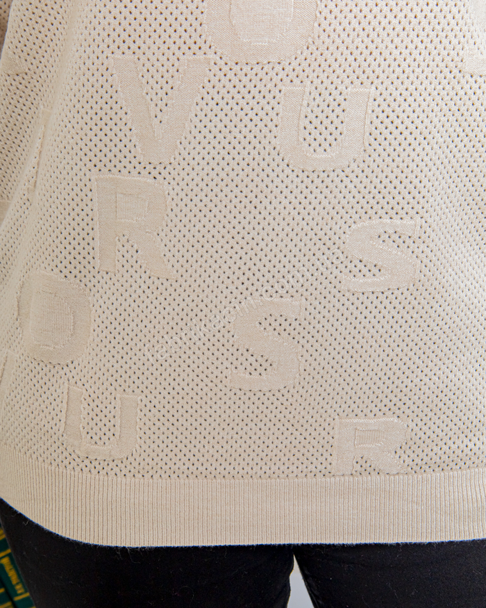 Очень модный и современный фасон, мягкий и приятный для тела. Ткань в сетку, не много просвечивается, и украшена вышитым узором в виде букв