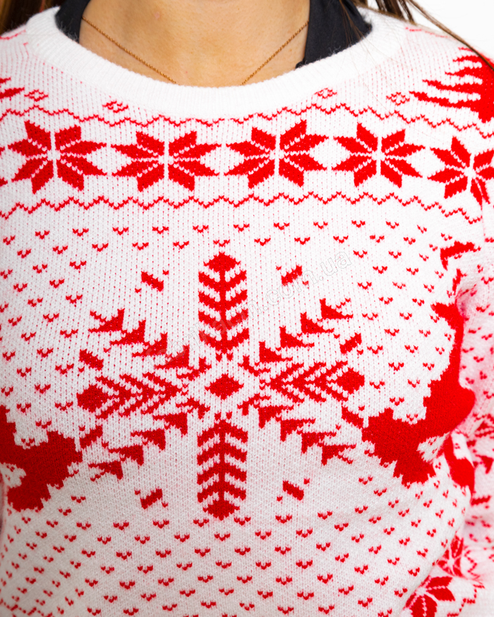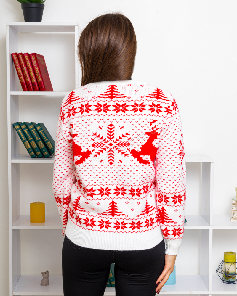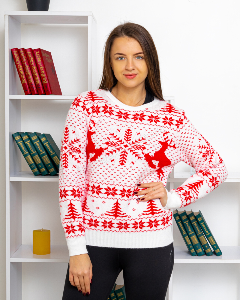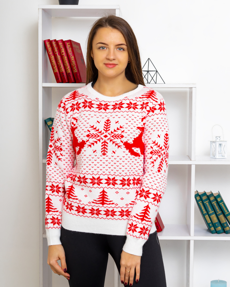 Комфортный женский свитер из теплого материала. Свитер с модным принтом в новогоднем стиле, в виде геометрических снежинок, елей и оленей. Свитер с длинными рукавами с манжетами. Подойдет для повседневной носки на зимний период. Можно стильно совмещать с другими элементами гардероба модных зимних образов.