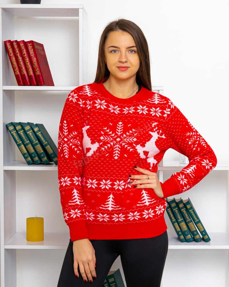Комфортный женский свитер из теплого материала. Свитер с модным принтом в новогоднем стиле, в виде геометрических снежинок, елей и оленей. Свитер с длинными рукавами с манжетами. Подойдет для повседневной носки на зимний период. Можно стильно совмещать с другими элементами гардероба модных зимних образов.