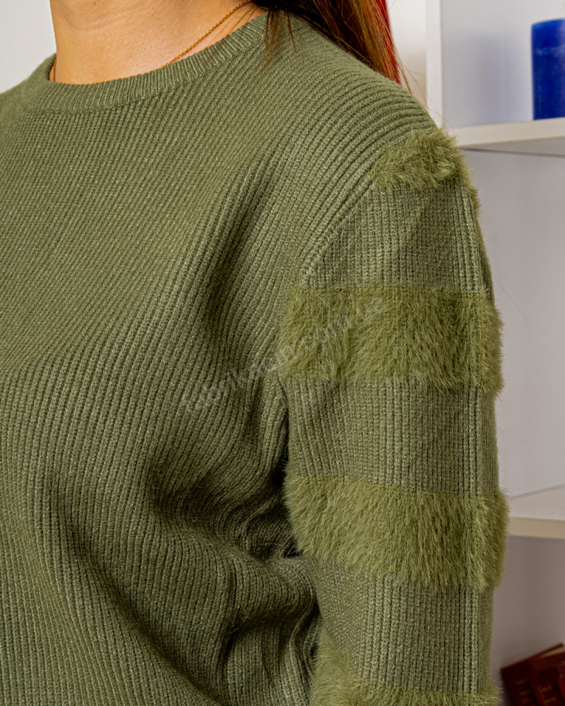 Однотонный свитер, с круглым вырезом, рукава имеют декоративные пушистые вставки, красивая вязка свитера. Состав: 45% VISCOCE 37% POLYAMIDE 18% MODAL. Выбирая размер смотрите размерную сетку ниже или на последнем фото