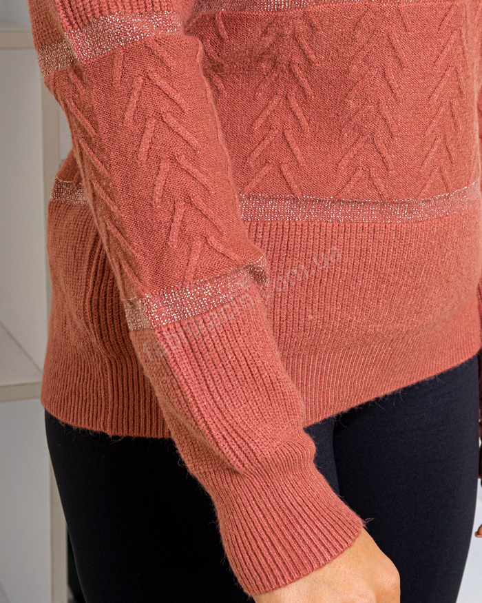 Мягкий, уютный, теплый свитер. На горловине и плечах ткань имеет ребристую текстру, по всему изделию проходит тонкий узор. Добовляют блеска изделию мерцающие горизонтальные линии. В составе 15% кашемира, 30% шерсти, 38% полимиад, 18% еластану. Выбирая размер смотрите размерную сетку ниже или на последнем фото.
