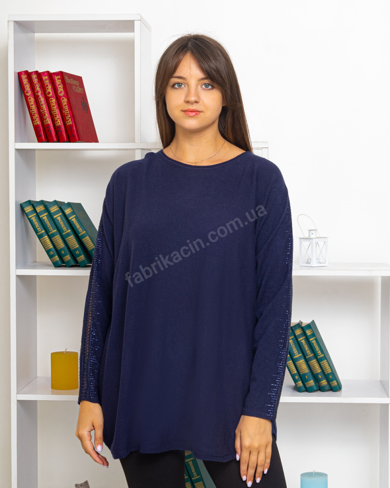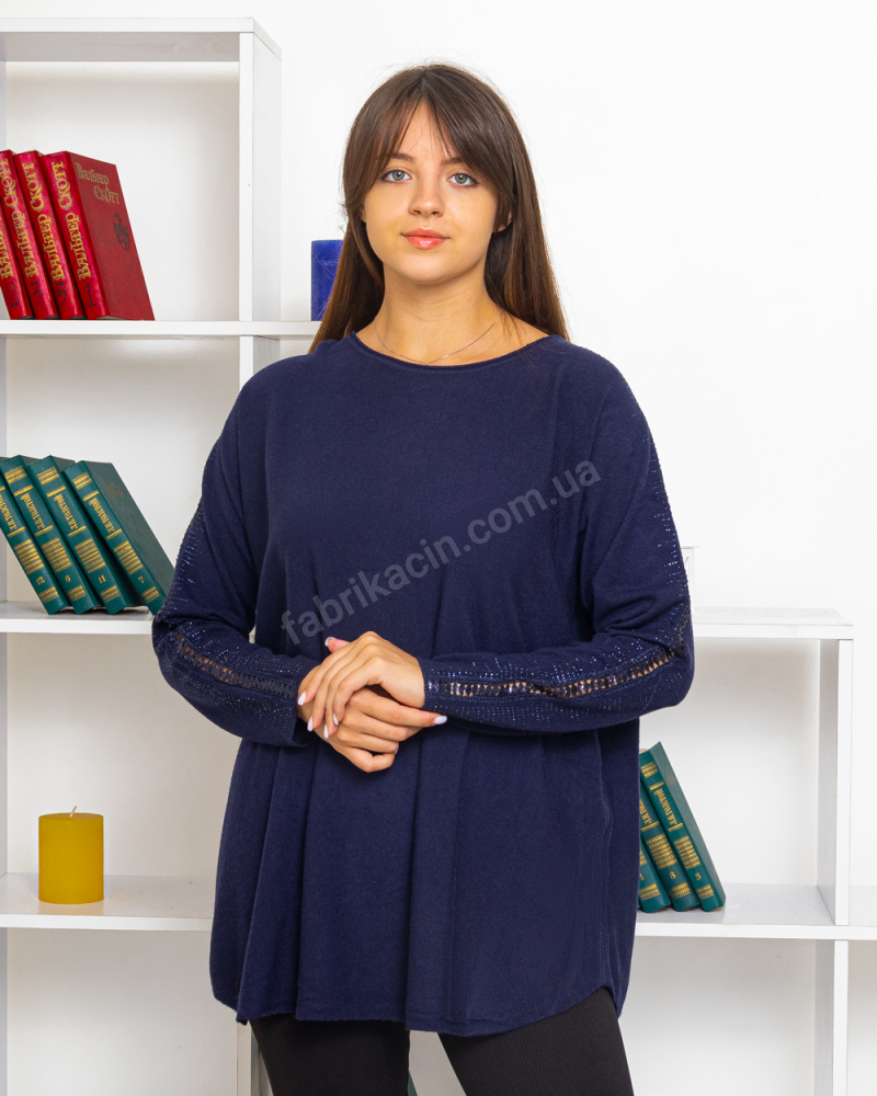 Свитер однотонный с красивым декором на рукавах, стразы. Свободного кроя, круглый вырез. Уход: - стирка в машинке на деликатном режиме или ручная стирка; - глажка только с изнаночной стороны Состав: 42% VISCOCE 30% POLYAMIDE 28% MODAL