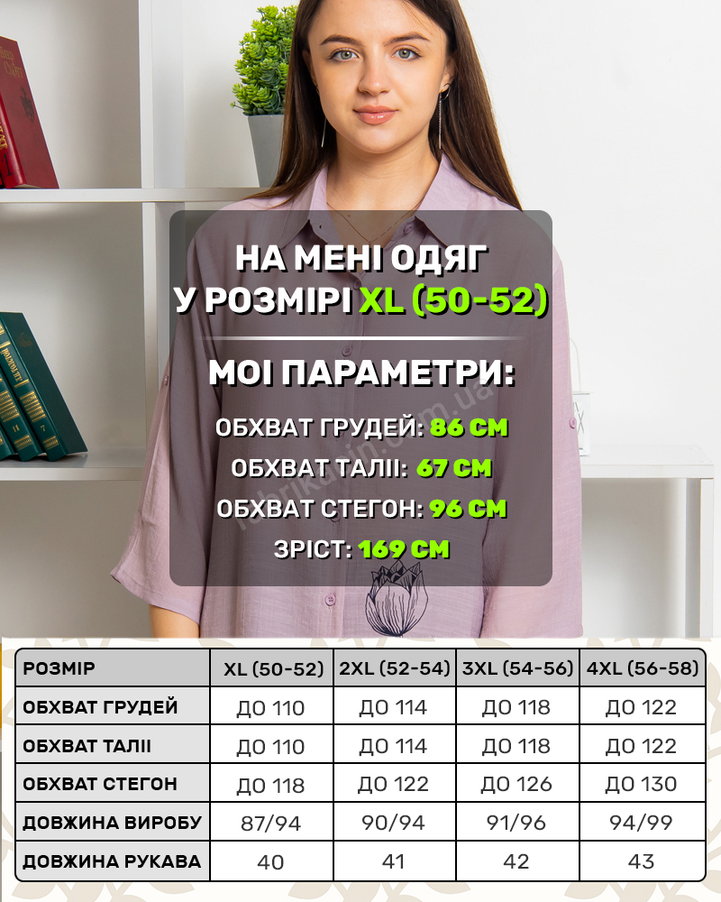 Подовжена вільна сорочка-сукня з коміром і рукав регулюється ґудзиком. На сорочці малюнок у вигляді тюльпанів, перед трохи коротше спинки, тканина не тягнеться, в наявності розміри: 50-52/XL; 52-54/2XL; 54-56/3XL; 56-58/4XL