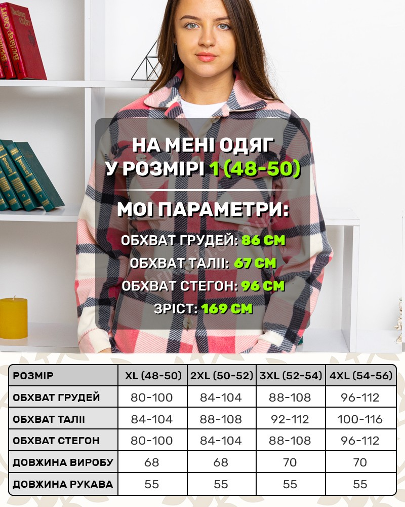 Сорочка в клітку класична, застібається на ґудзички. Перед трохи коротше спинки. В наявності розміри:46-48/1; 48-50/2; 50-52/3, 52-54/4. Зверніть увагу; виріб маломірить на один-два розміри (див. таблицю) у розмірній сітці нижче ми заміряли рукав. Якщо потрібний вільний варіант: оверсайз, вибирайте більший розмір